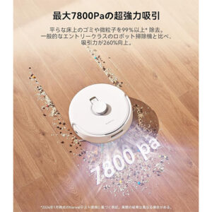 この掃除機は、一般的なエントリークラスのロボット掃除機と比較して吸引力が260%向上した、最大7800Paの吸引力を備えています。平らな床に散らばったゴミや微粒子を99%以上除去可能で、家庭内の清掃を効率的に行います。この強力な吸引力は、特にホコリや細かなゴミが多い環境で威力を発揮します。