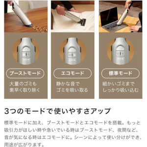 コンパクトでスタイリッシュなデザインに加え、従来の2倍の吸引力を実現しており、細かいゴミから大量のゴミまで、効率的に検討できます。掃除場所や時間帯に応じて最適な吸引力を選んで3つのモードを搭載しています。 ブーストモードでは強力な吸引で大量のゴミを短時間で吸い取るため、リビングやダイニングの集中的な掃除に最適です。エコモードは静音設計で夜間や音を抑えたい場所での使用に向けて、省エネ効果も発揮します。標準モードでは、細かいゴミをしっかり吸引し、普段の掃除に最適なバランスの取れこの掃除機は、ハンディとしても使用可能で、屋内や狭いスペース、家具の隙間など広い場所で手軽に使える点も大きな魅力です。